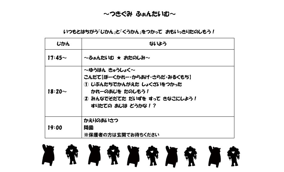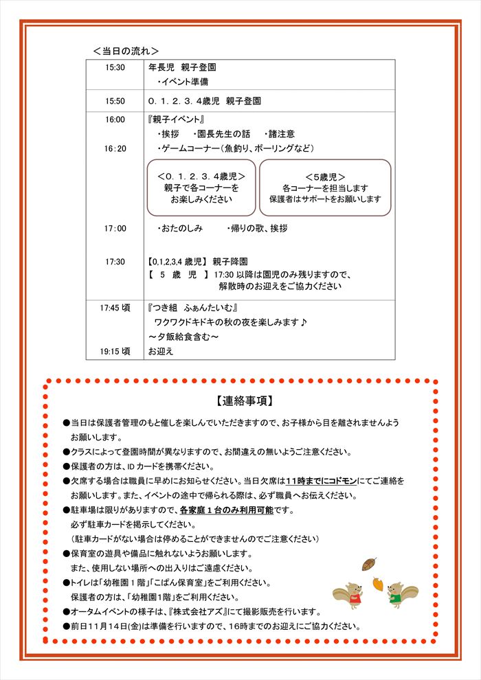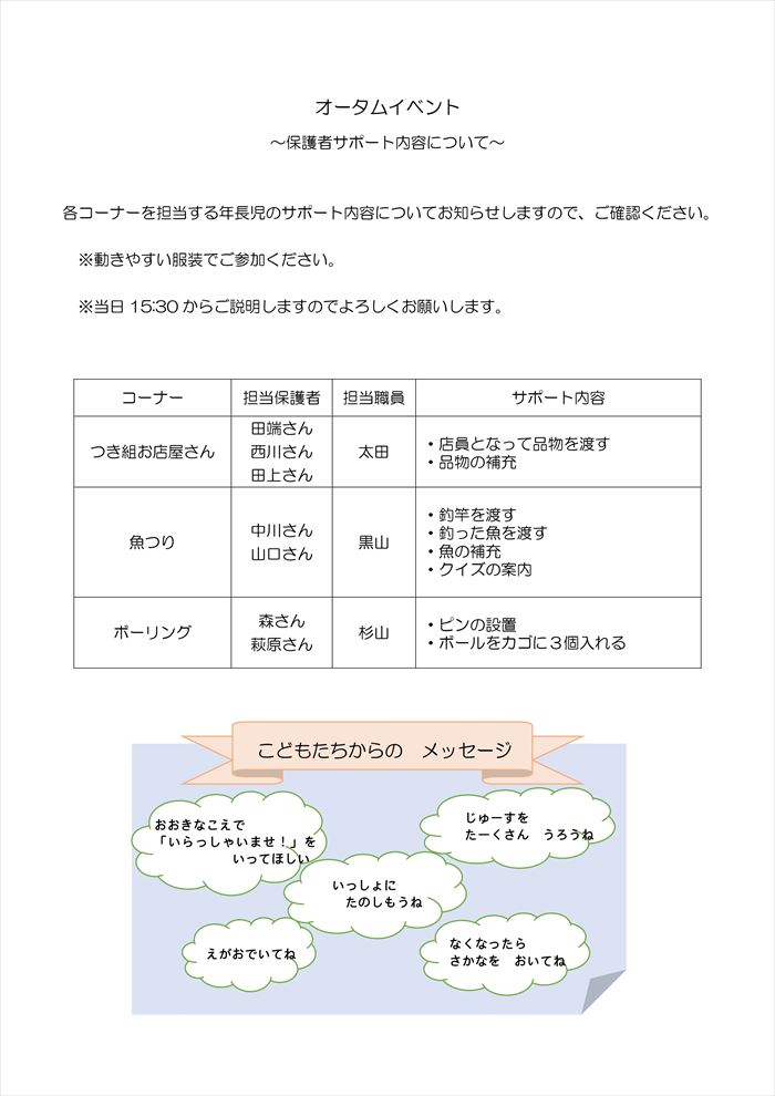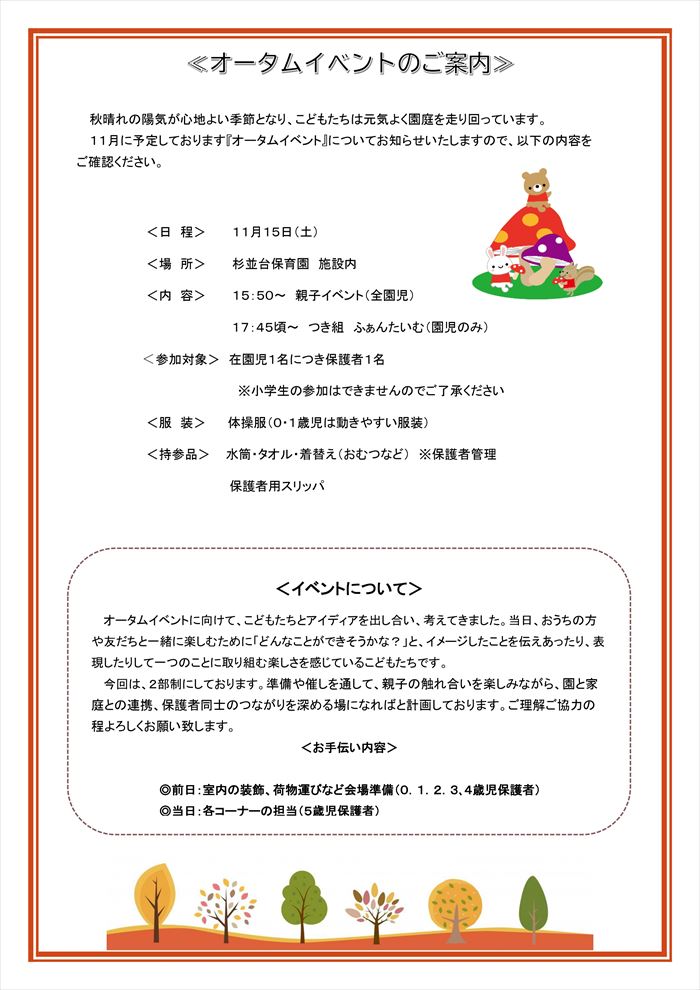 オータムイベント TOP 2025.11.132025.11.20 Suginamidai Nursery2025AutumnEvent Suginamidai Nursery2025AutumnEvent オータムイベント その後の様子をお届けします ①おてつだい1②おてつだい2③先生たち1④先生たち2⑤先生たち5⑥先生たち6⑦先生たち3⑧先生たち4⑨つき組 よろしくおねがいします⑩つき組 これまで取り組んできたこと⑪つき組 デザイン⑫つき組 しっかり持ってね⑬お面 ありがとうございます!⑬-1何色がいいかな?⑭つき組 じょうず~⑮つき組 はいどうぞ1⑯つき組 親子で協力⑰つき組 はいどうぞ2⑱つき組 サポートありがとうございました⑲一筆描きに挑戦⑳何を描いたか わかるかな?㉑チームで協力㉒答えは? せーの!㉓みんなで音頭♪㉔手作りシェードでお見送り㉕手作りシェードでお見送り2 ご案内 会場 見取り図 年長組保護者様へサポート内容について オータムイベント活動内容紹介 ドキドキワクワクファンタイム 杉並台保育園 〒861-1112熊本県合志市幾久富1656-485 TEL 096-274-2727